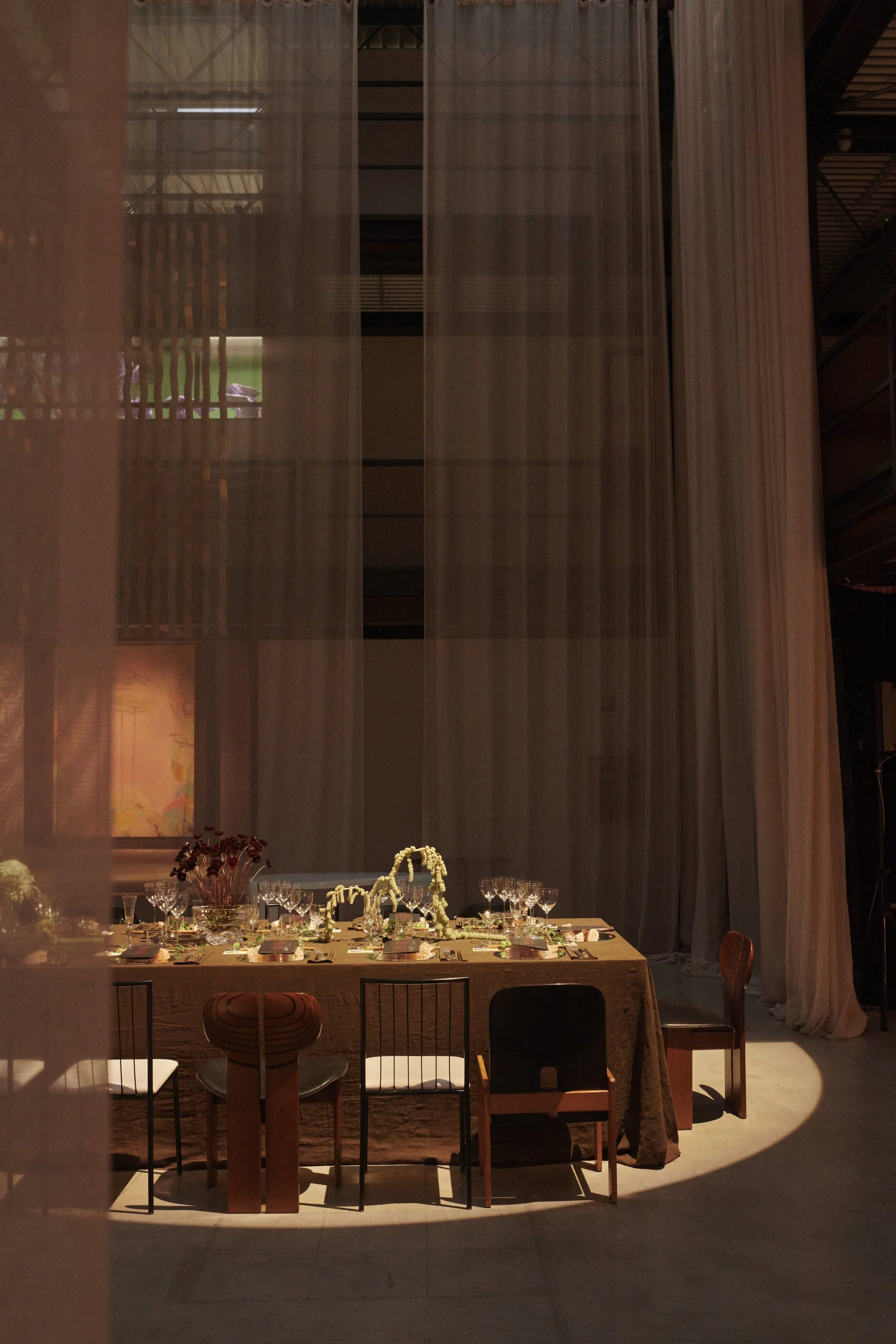 ”Notturna. A Night at Depot" - a special dinner event and installation held at Nilufar Gallery, during Milan Fashion Week in 2023, curated by Around Studio, showcasing Italian designer Erika Cavallini's work with a unique, atmospheric theme called "Notturna" featuring art, design, and food.